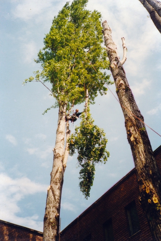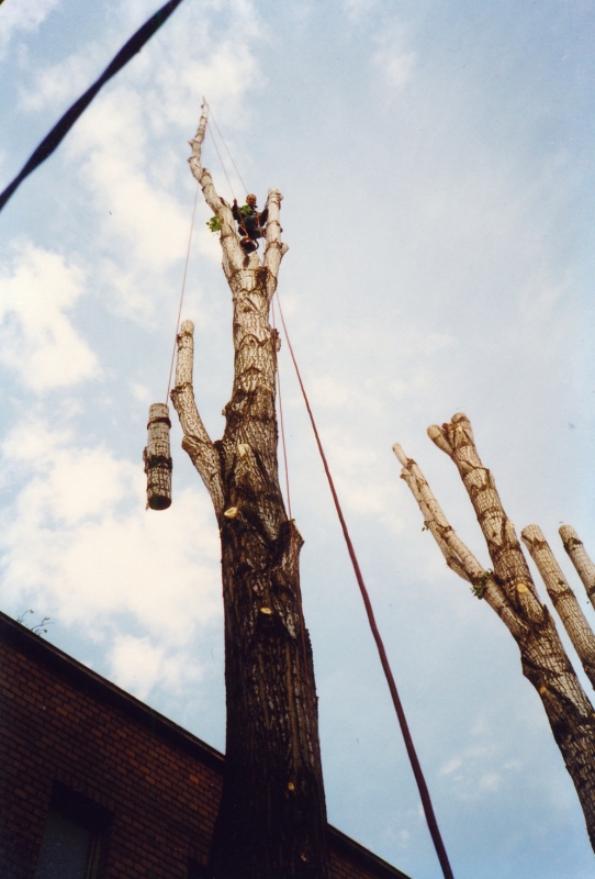 Nous effectuons l’élagage et l’abattage des arbres en technique de grimpe. L’avantage de ce procédé, à l’opposé de la nacelle sur camion, c’est qu’il permet d’accéder à tous les arbres indépendamment du fait qu’ils se trouvent dans une cour intérieure, dans un cimetière entre les tombes ou sur une paroi rocheuse escarpée, en plus le terrain du chantier sera exempt de dommages et dégradations causés par les roues du camion.